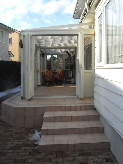 既存のウッドデッキを再利用し、さらにタイルテラスを追加した上に2棟続きのゆったりとしたガーデンルーム「暖蘭物語」。