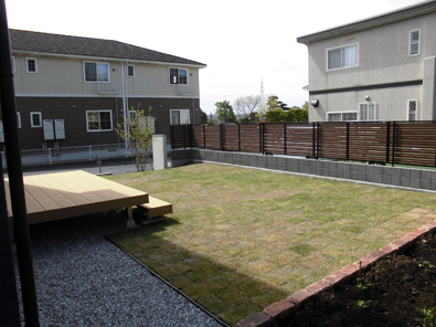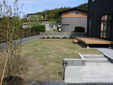 高低差があった敷地をコンクリート土留めで盛土され、平らな庭が広がりました。
